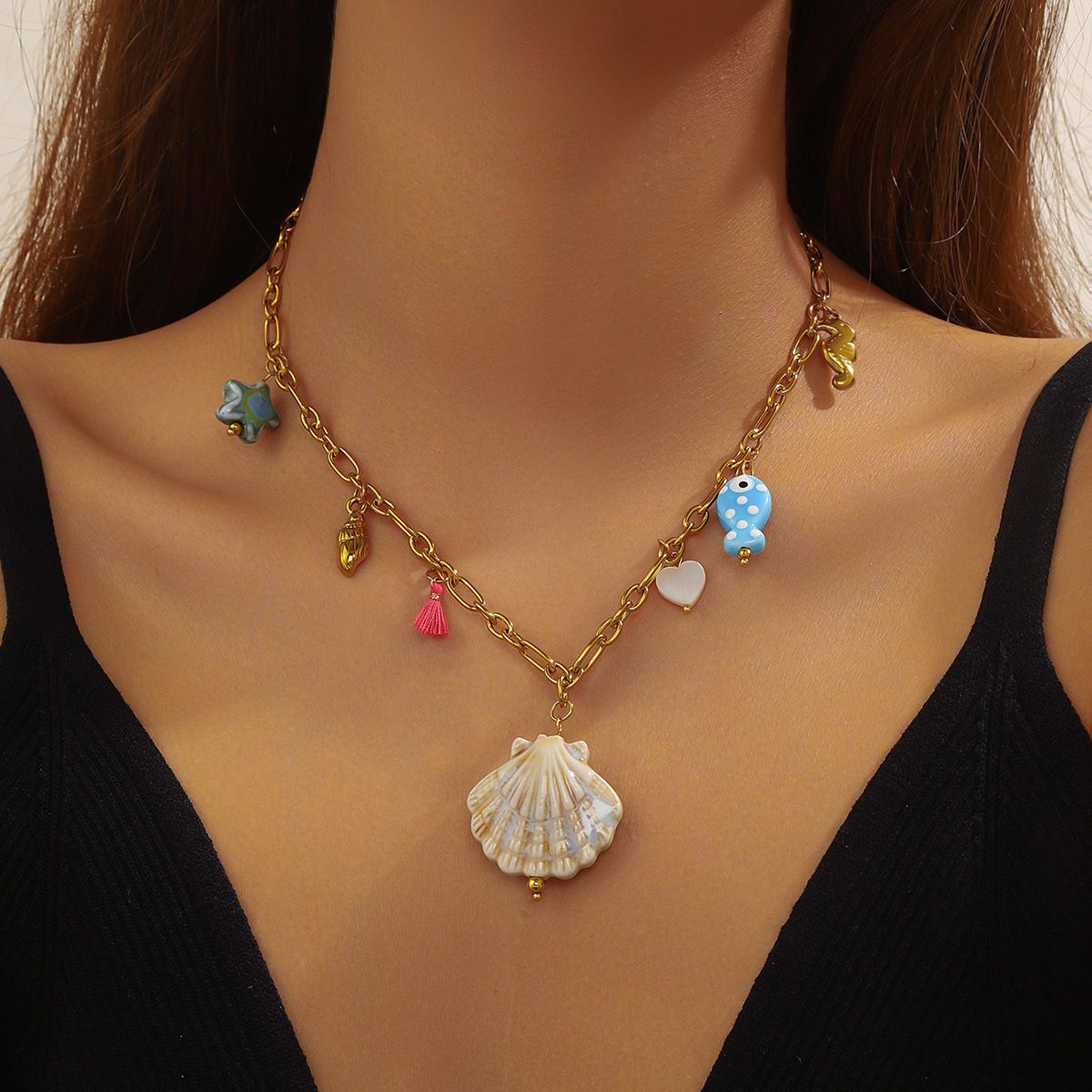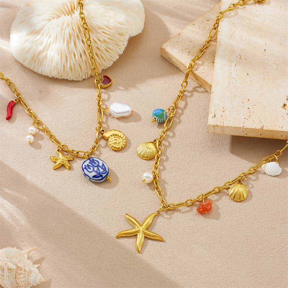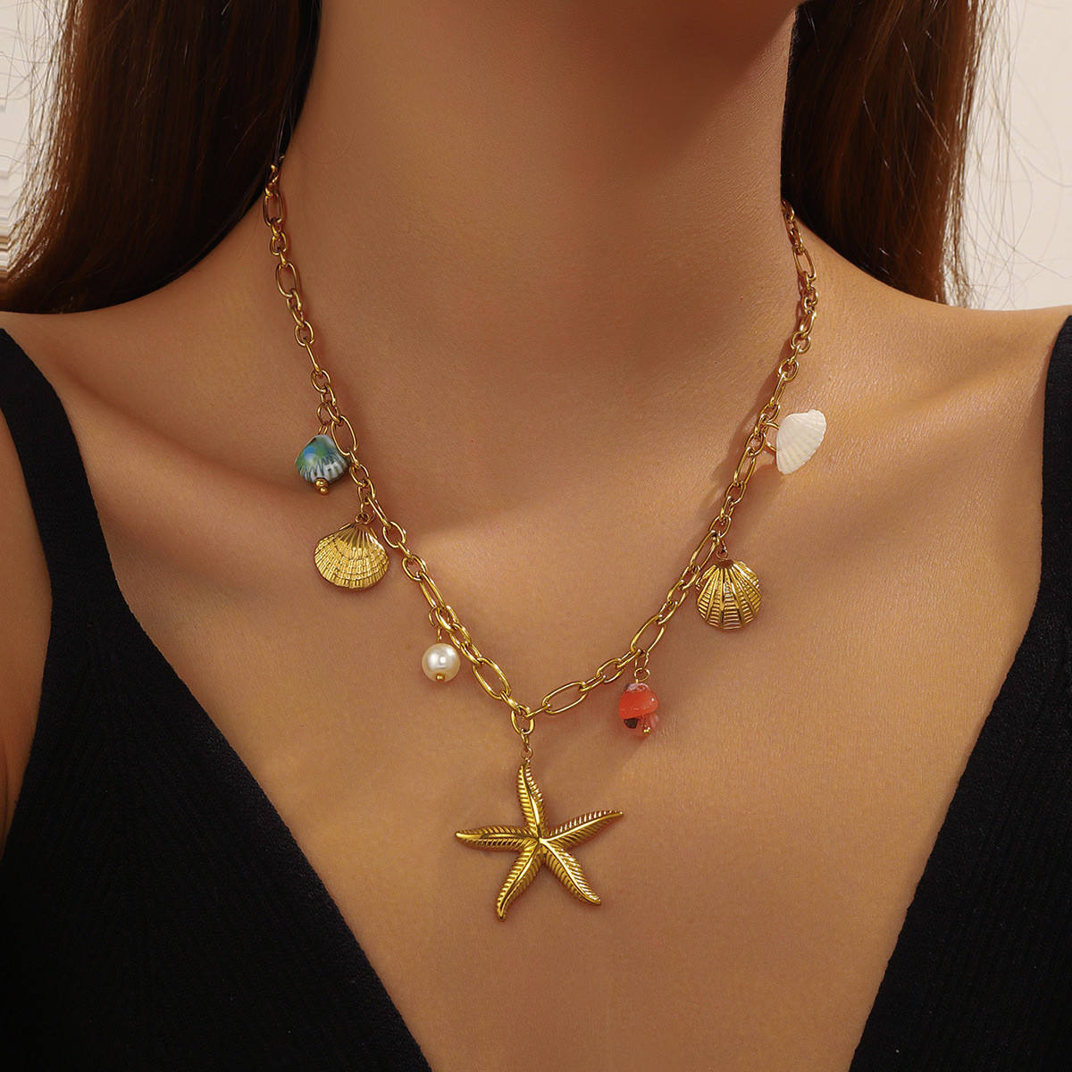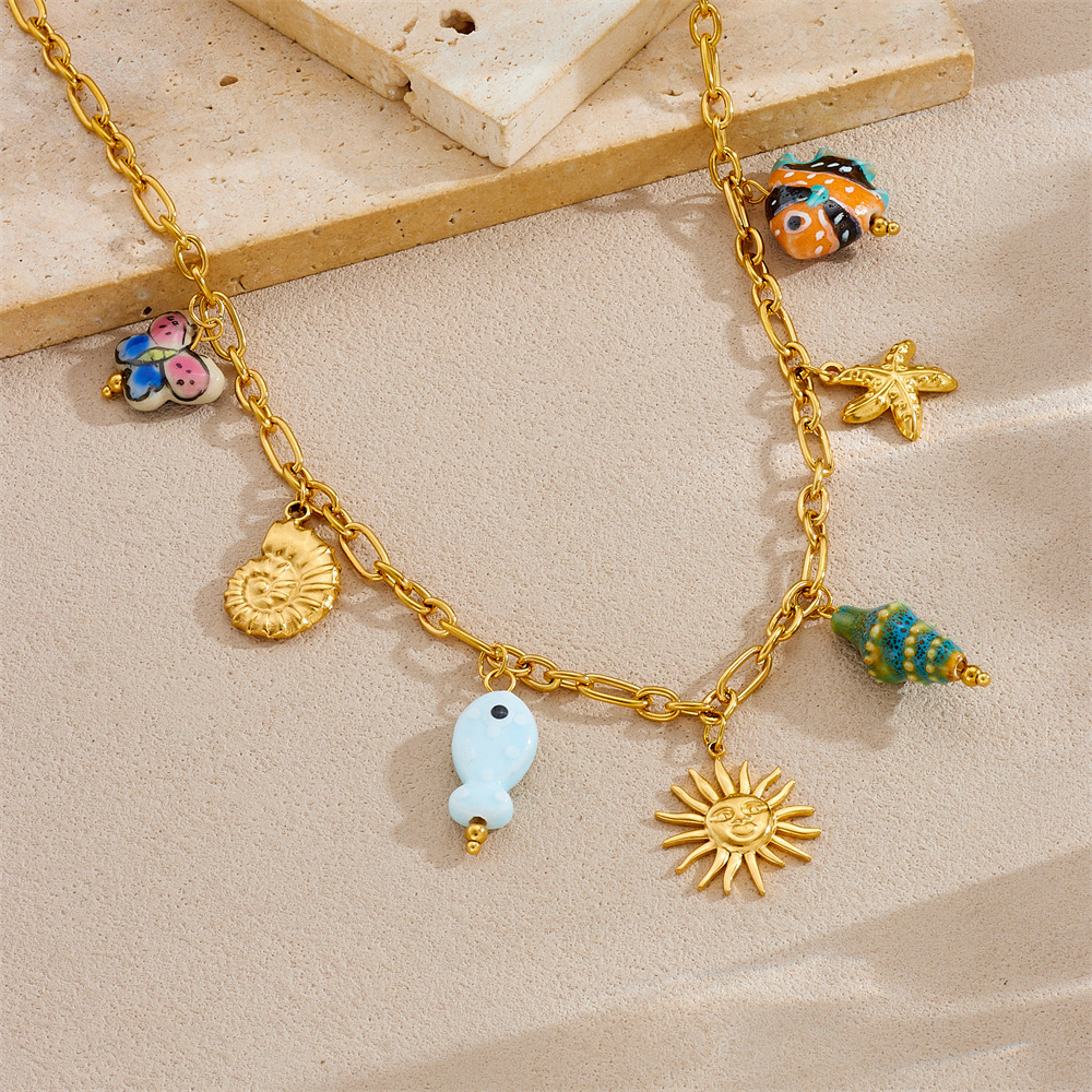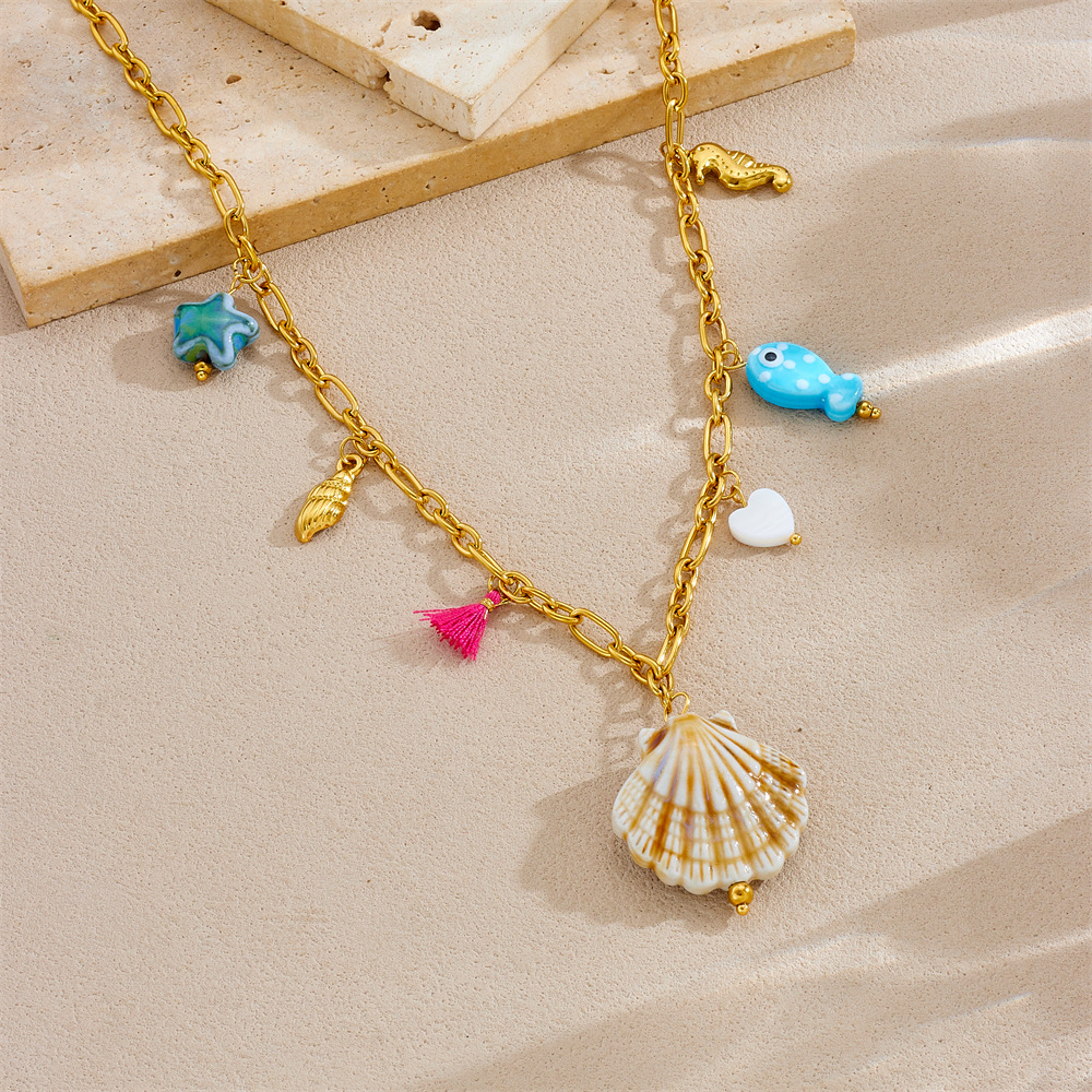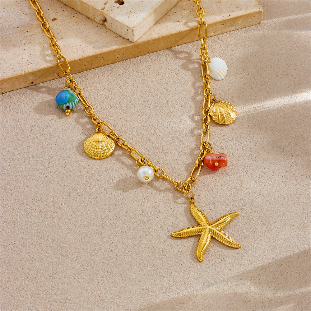 Home > New Arrival > Vacation high-end multi-element marine life pendant seashell starfish sun stainless steel necklace