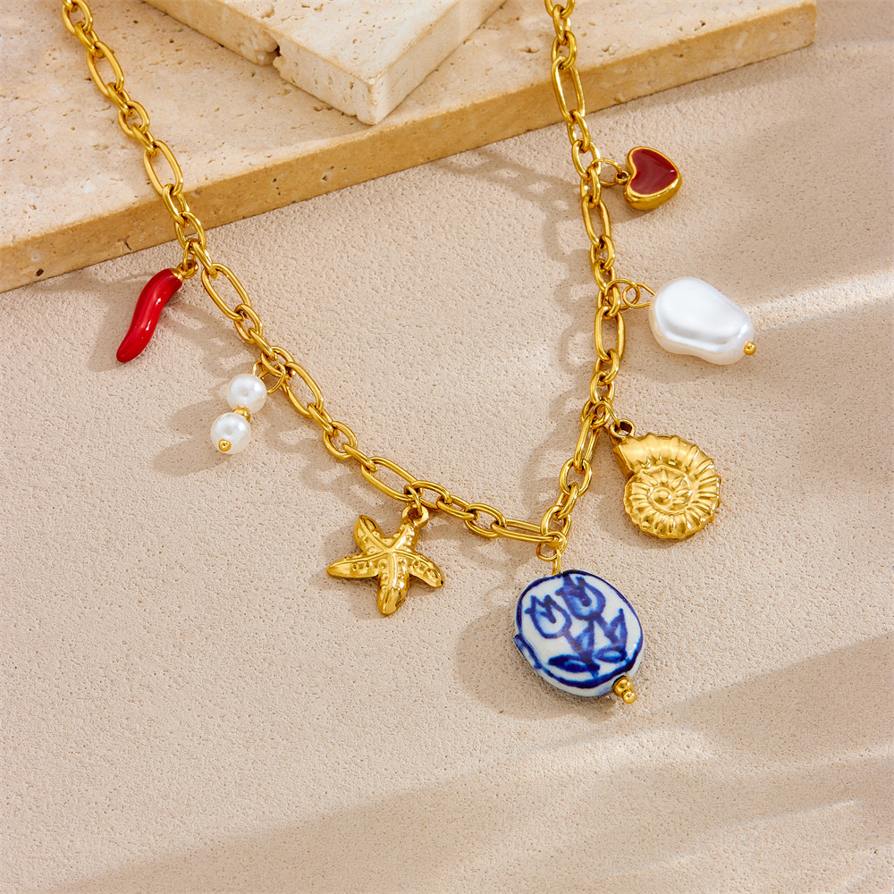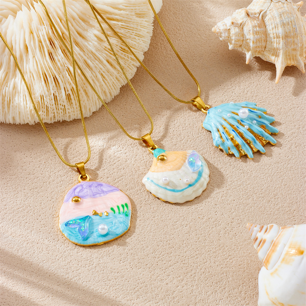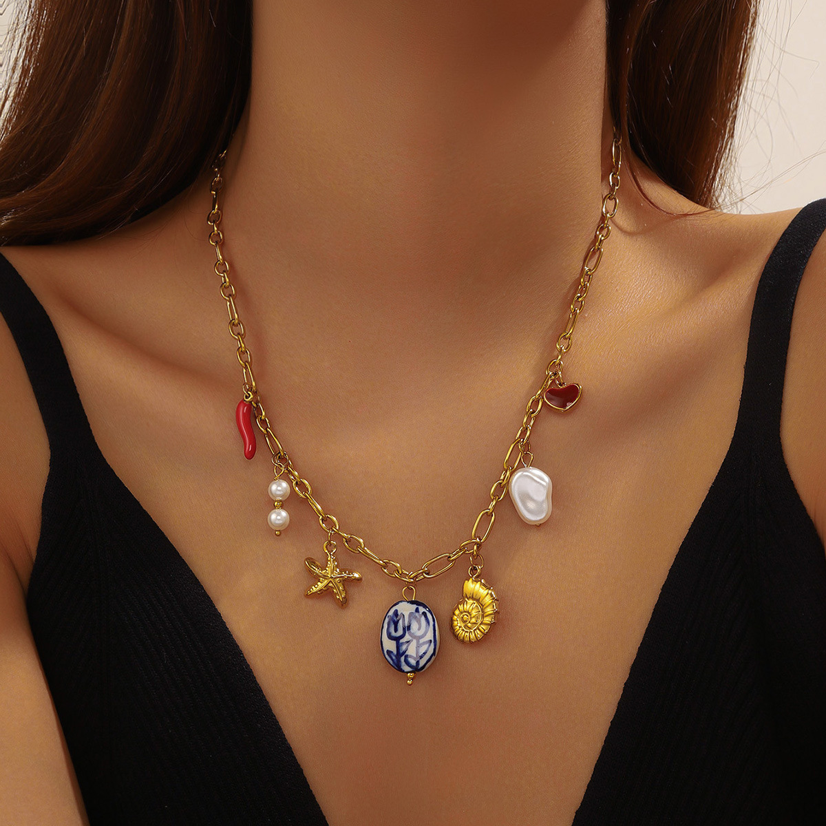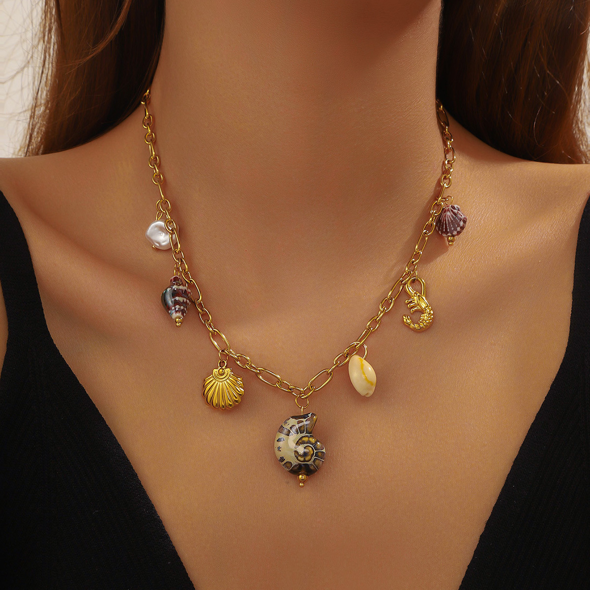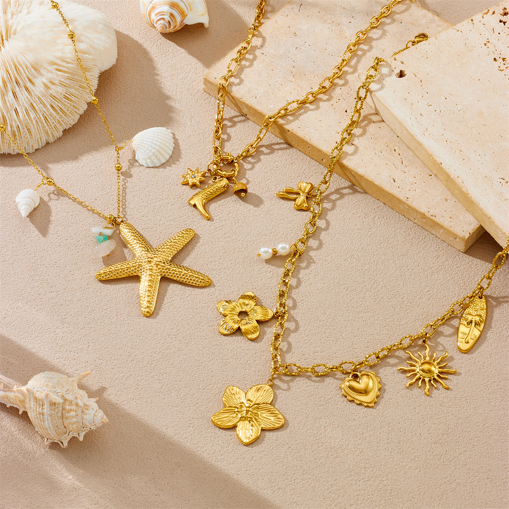 Home > New Arrival > Vacation high-end multi-element marine life pendant seashell starfish sun stainless steel necklace