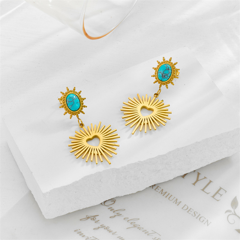 Home > New Arrival > Vintage turquoise retro sun heart irregular earrings geometric oval titanium steel earrings